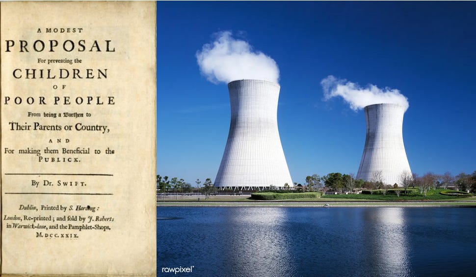 Let's start with Swift. In 1729, Jonathan Swift penned A Modest Proposal for Preventing the Children of Poor People From Being a Burden to Their Parents or Country, and for Making Them Beneficial to the Publick. Let us forgive him for misspelling "public". He was European, after all, and Europeans cannot plan an energy economy, much less master the economy of letters. And we will shorten his title to A Modest Proposal, which is already an 88.9% savings in energy costs. Also, 1729 is the smallest integer that is the sum of two positive perfect cubes in two different ways. We shall see if this comes in handy.