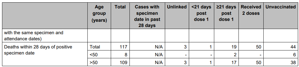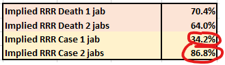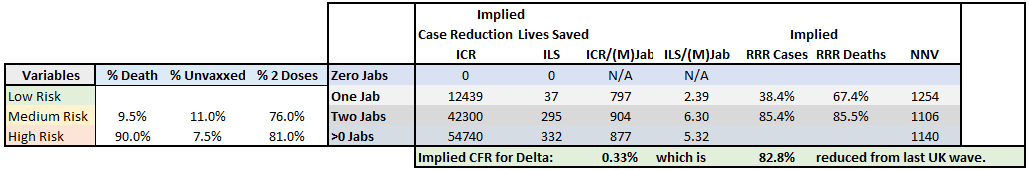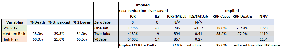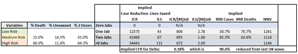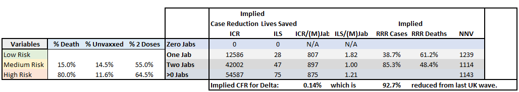 The relative risk reductions (RRRs) for 1 and 2 jabs look slightly better than last time, but the vaccine efficacy in stopping mortality looks a little worse than last time (70.7% and 63.6% RRR). Notice that the Delta variant looks to be 90.6% less deadly in this case output. That's great news!