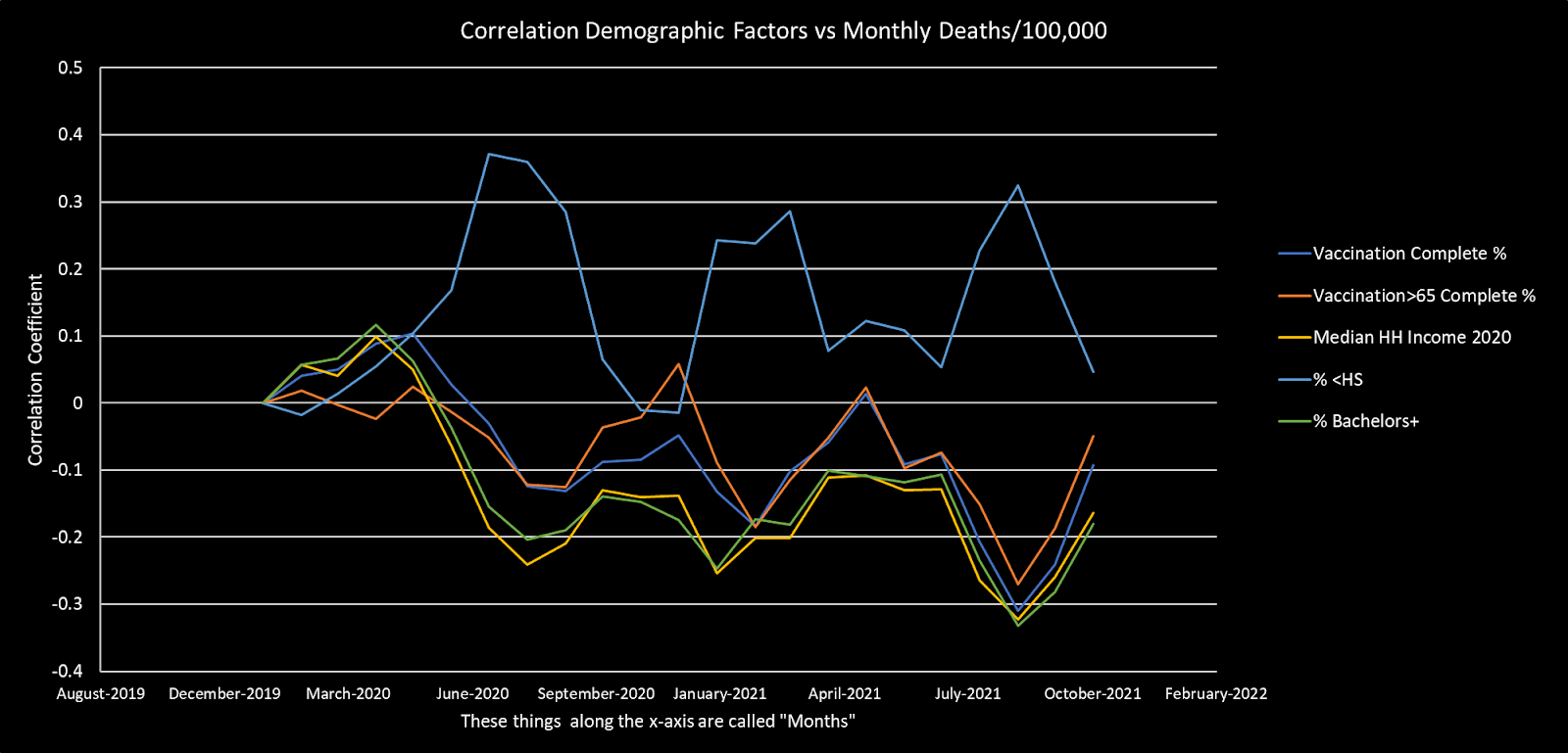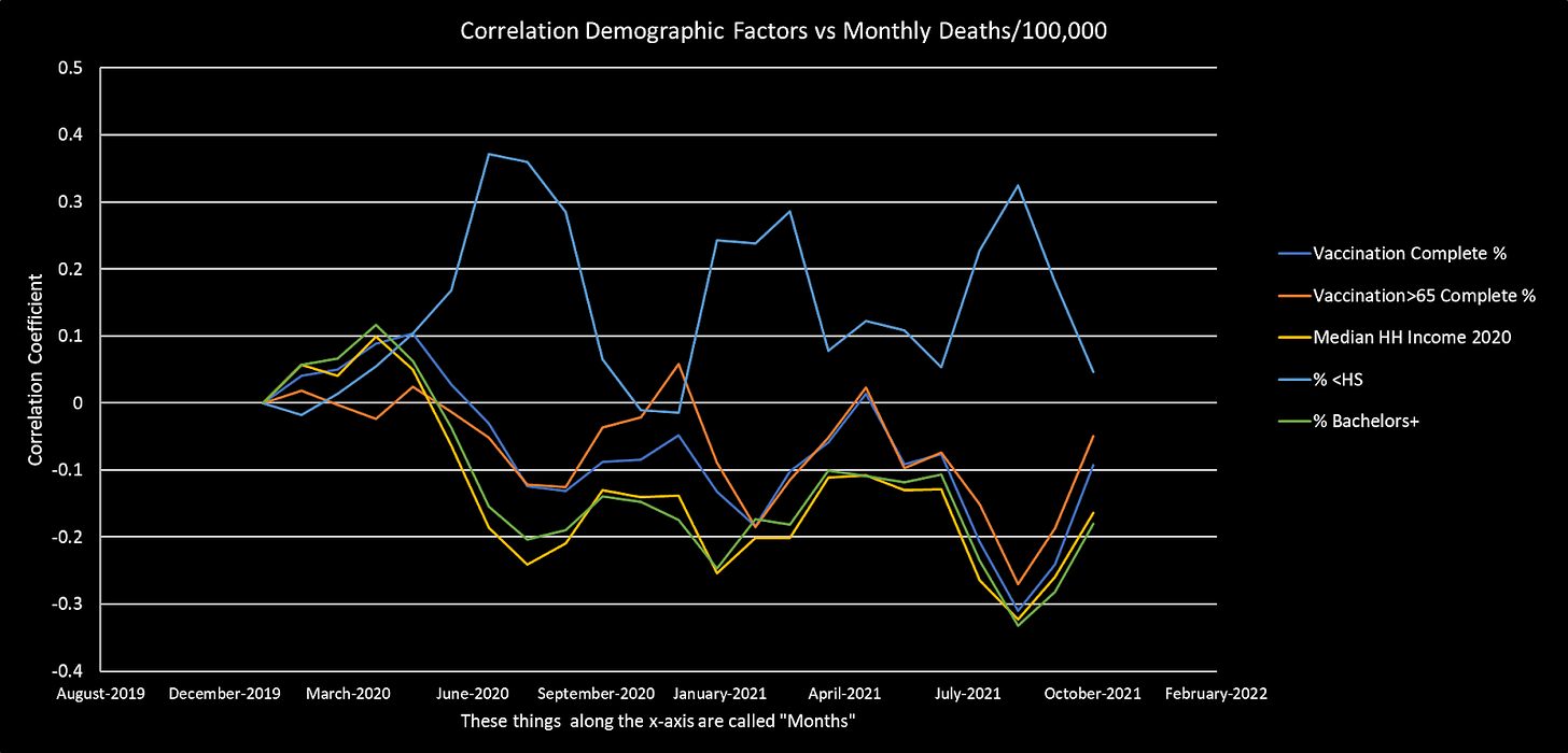 My next observation is the one that reaches into the culture war: median household income (yellow) and percentages of residents with bachelor degrees (green) are negatively correlated with COVID-19 mortality, while the percentage of residents without a high school diploma (light blue) is positively correlated with COVID-19 mortality. At least since early during the pandemic.