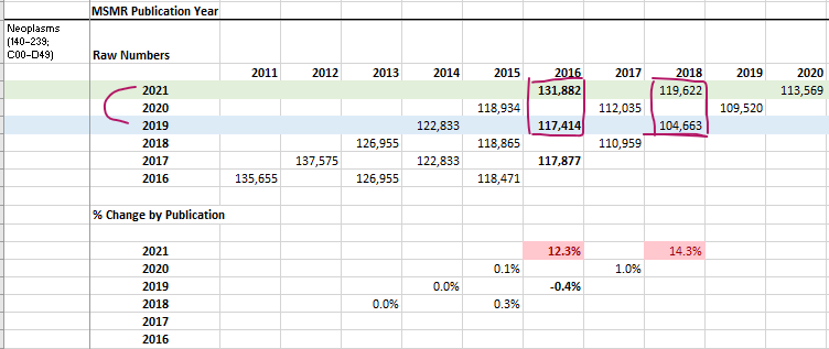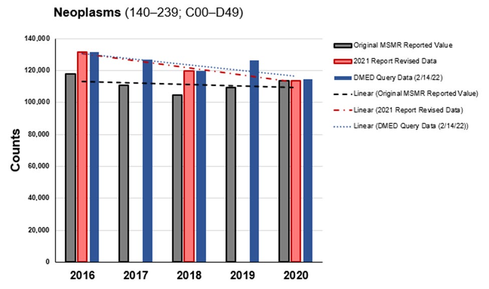 We did check to be sure that the MSMR data should pass through faithfully to DMED. We compared the 2021 MSMR (red) totals by diagnostic category to queries from DMED run January 31, 2022 or later, and found close matches for all but one major diagnostic category, which is "Signs, Symptoms, and Ill-Defined Conditions (R00-R99)", which seem to have been revised upwardly again since the May 2021 MSMR. Here is the comparison for Neoplasms (cancer):