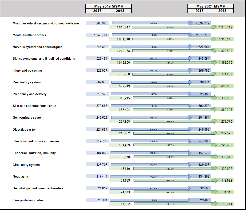 I plan to publish these graphs for all major diagnostic categories in the future, but suffice it to say that the most recently published MSMR reports are almost identical to recent DMED queries in all categories except for one. I'll get to that…