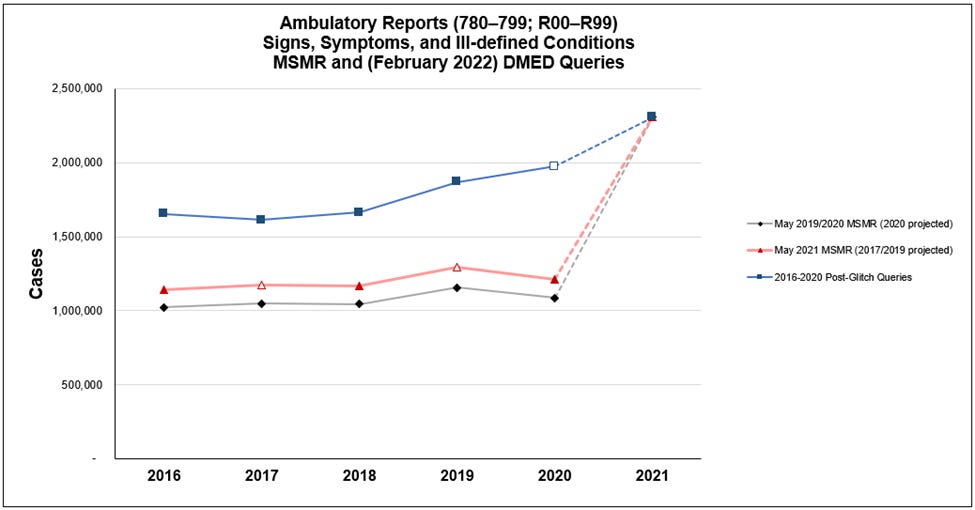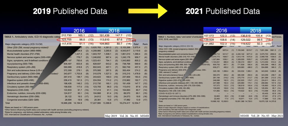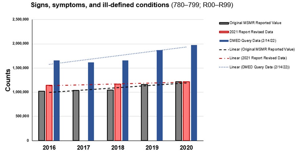 Since then, I have devoted several weeks combing through data from the Defense Medical Surveillance System (DMSS) via the Defense Medical Epidemiology Database (DMED) and other sources. Understand that these numbers will change in a final report, but that's not because the whistleblowers did anything wrong, or because there are no signals of harm from the experimental quasi-vaccines. There are plenty of clear signals. And what I suspect took place with regards to the data looks far uglier for the Department of Defense (DoD), or at least those responsible for the medical data.