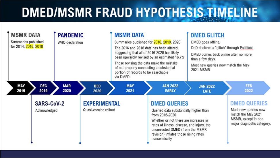 One way or another, we'll have to see what the DoD claims about the dramatic and unexplained revisions in DMSS/DMED via the MSMRs. Perhaps there is an explanation that I haven't considered? Why then was it not offered in May 2021, or in January of this year?