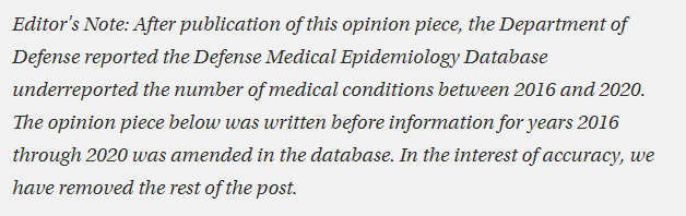 Fortunately, the wayback machine had stashed archives of Daniel's article. Unless I missed something, there is no claim either in the testimony at the Johnson hearing, nor in Daniel's article at The Blaze of an 1100% increase in deaths. So the fact check does appear to be entirely a straw man. I suspect that Daniel took his article down due to my investigation into the MSMR (linked at the start of this article), and the revelations that the initially queried data probably was not correct (I feel almost certain that it wasn't, but that it opened the right can of worms). However, that doesn't mean that the post-glitch data is correct. I am also almost certain that the current DMED data is the result of unlawful manipulation of the DMSS/DMED. And that should be of greater concern to an honest fact checker.