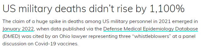 Meanwhile, nobody is even willing to talk to the media (or "fact checkers"), or come to court to fully explain the data manipulations, and the CDC isn't publishing their own pulled data from these databases. Nobody at the top of the decision chain in the DoD seems willing to have a much-needed conversation about any of this, and nobody will even put their name beyond the extremely thin "fact checks" that…still haven't approached a word of any of what I've found to this point in time.