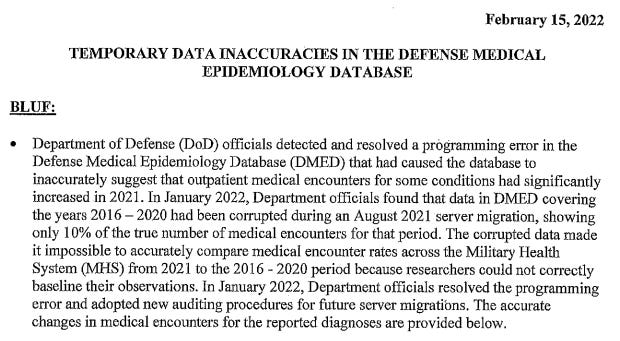 Right now I'm wondering if somebody in the DoD saw the rates of certain illnesses skyrocketing during the early months of 2021, made the decision to falsify the ambulatory reports for the May 2021 MSMR (jacking them up where needed to mask safety signals), then decided to pre-empt any investigation into the DMSS/DMED by leaving DMED in a sabotaged state, and with a fully prepared plan to muddy the waters with a "glitch" story.