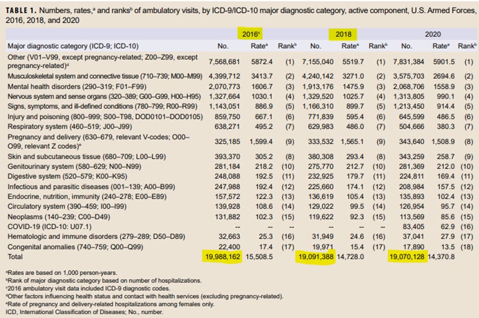The changes, which average 13.5% per category per year comparison, bring the 2016-2020 data (assuming these five years were all altered in the same way) much more in line with the numeracy of ambulatory illness and injury reports in 2021. There is no asterisk or explanation, which would never happen in an important database. I searched back over a decade and found no other large manipulations. The change in ambulatory reports was more than two orders of magnitude larger than small updates that are typical of the data due to simple issues like late records filed or re-dated. The most parsimonious explanation is that somebody with control over DMSS/DMED fraudulently manipulated the data in order to mask vaccine-associated harms.