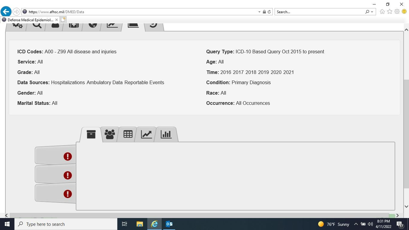 Once a year in May, the MSMR includes summaries of ambulatory and hospitalization data from DMSS/DMED, organized by major classifications of medical billing codes. Each summary includes three prior (staggered) years of data. For instance, the primary data table in the May 2021 MSMR looks like this: