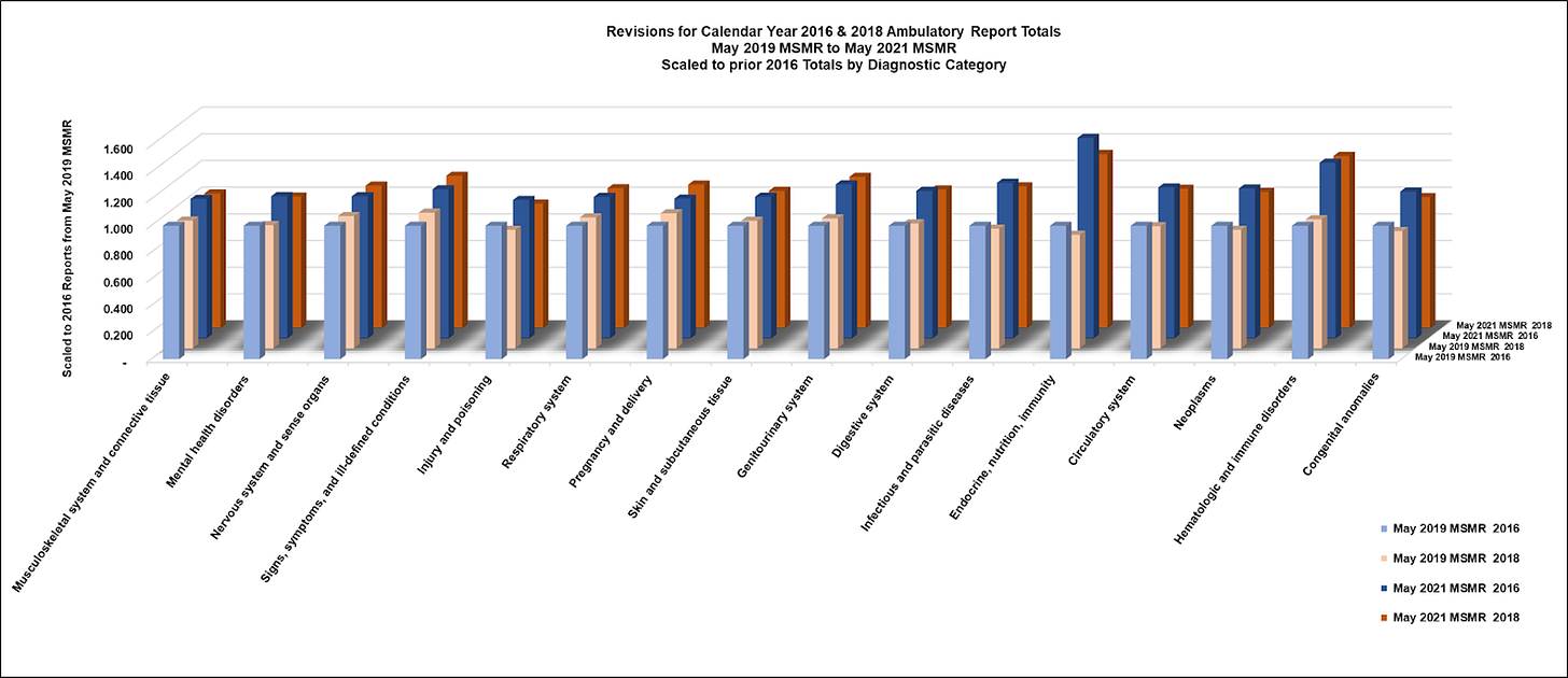 What the whistleblowers later discovered in their queries, and then reported via Renz, was likely an artifact of the manipulation process, which I will explain further. We should be thankful that they opened this can of worms for further examination. They sounded an alarm that drew attention to the DoD's behavior with respect to the data. But before we get into that, here is a visual of the data manipulations by category. Each pair of bars at the bottom was data as published in the May 2019 MSMR, and the pair of bars in the back are what was published in the May 2021 MSMR.