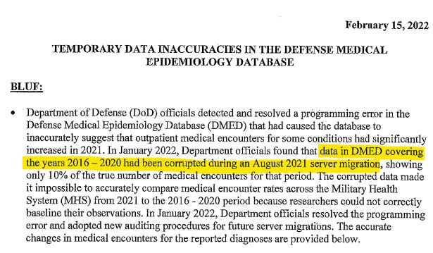 There was a server migration in August for DMED. As of mid-February, the DoD claims the glitch was introduced at that time. While this is possible, I prefer either my theory that the data was corrupted in April, or that the corruption was a combination of the April partitioning and August server migration. I also worry that the server migration was a way to wipe fingerprints of engineered data fraud.