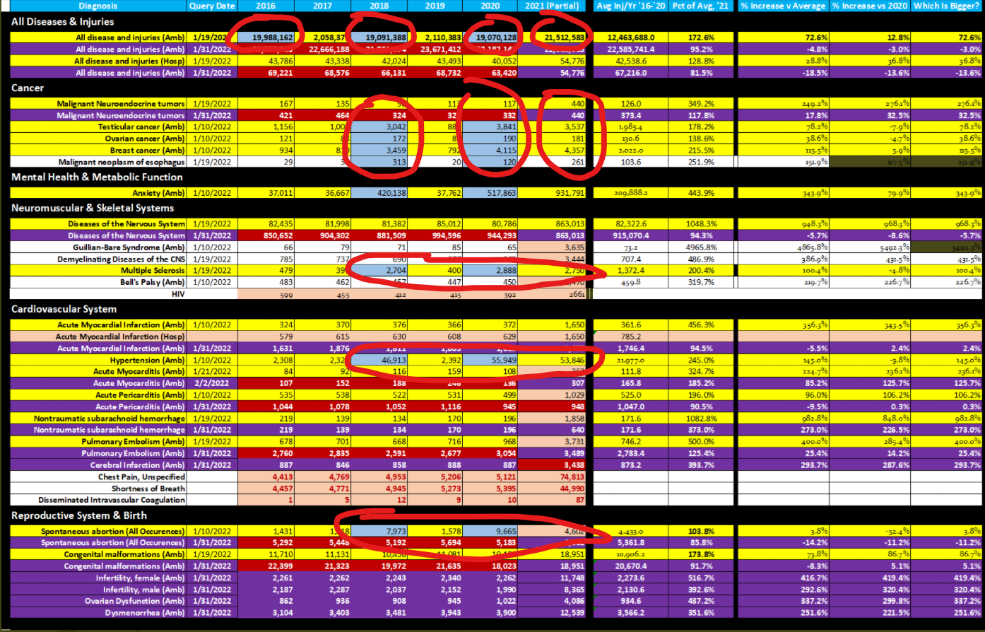 Whether or not it turns out that the correct numbers are closer to the 2021 numbers, we need to understand the data. It may be that neurological conditions are up 40%, not 1000%, but that's still a reason for concern that we need to understand. Maybe cancer is only up 20%. That's still very bad news that we would need to examine with respect to the q-vaccine campaign and test for temporal association.