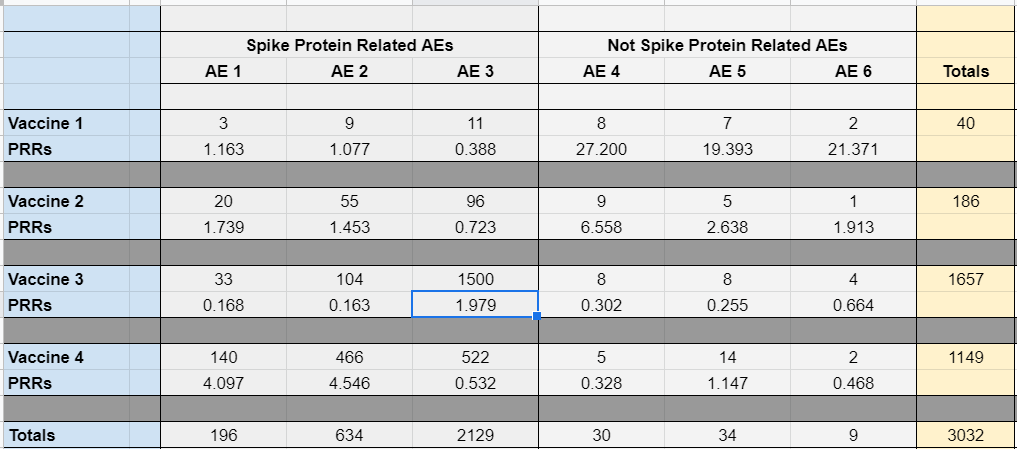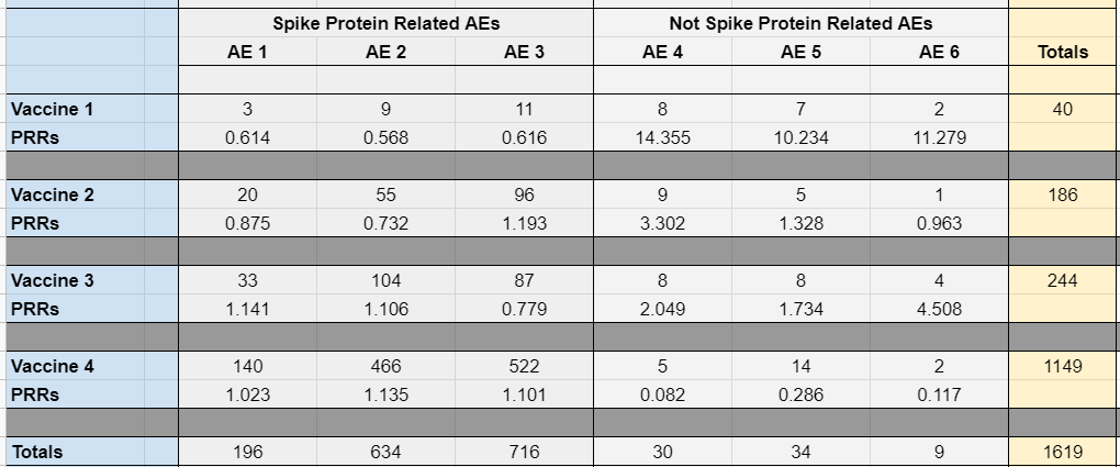 Where we do see PRRs stray far from 1 (a sort of baseline) is for the safest vaccine (the first up top), or among the AEs that are least likely to be causally associated with the actual vaccines (which I labeled as "not spike protein related" since the spike protein seems to be the variable that distinguishes the current vaccines from traditional ones). Note that even if I take a cell such as Vaccine 3's AE 3 (which could be Bell's palsy or heart failure or death) and plug in some enormous number like 1500, there is still no safety signal as per CDC definitions: