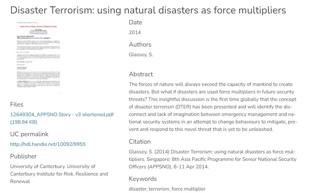 That term disaster terrorism finally bubbled to the top of my brain after the Lahaina fire. Though I did not want to jump to any conclusions or soak up any of the conspiracy theories (some of which may very well be true) faster than I could digest the possibilities, I decided to perform a search to see if anyone was using it. I found just one reference (Glassey, 2014).