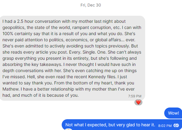 People are reaching out for information. They know that the official narratives are junk, and they know that a lot of the counternarratives are also junk. What they aren't certain about is which of the people contradicting that narrative are honest actors. That's tough. I get it. It takes a lot of people to sort through so much information.