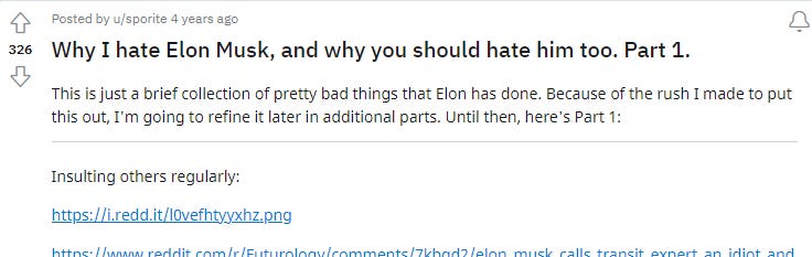 Elon's detractors have lists. As I've said, I haven't done a deep dive. But the point is that they have lists. In multiple parts.