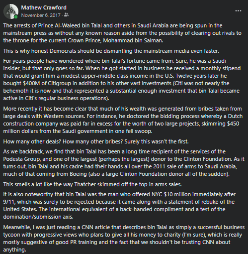 Prince bin Talal works Western media like few outlanders possibly could. While most of the early reporting specific to bin Talal seems to have been scrubbed from the internet (not all media is quite so savvy as to cover those tracks), you may recall that major Western media reported the he was detained and tortured during Crown Prince Mohammed bin Salman's "anti-corruption crackdown" or "power consolidation" or whatever actually went down in 2017.
