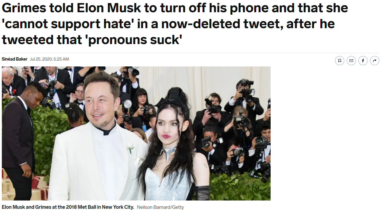 Elon dared to wade into the all-important pronoun debate, which is an instant boundary that signals whether you'd be put up against the wall when the revolution comes. Do you think she'd shoot him? I'm honestly not sure either way.