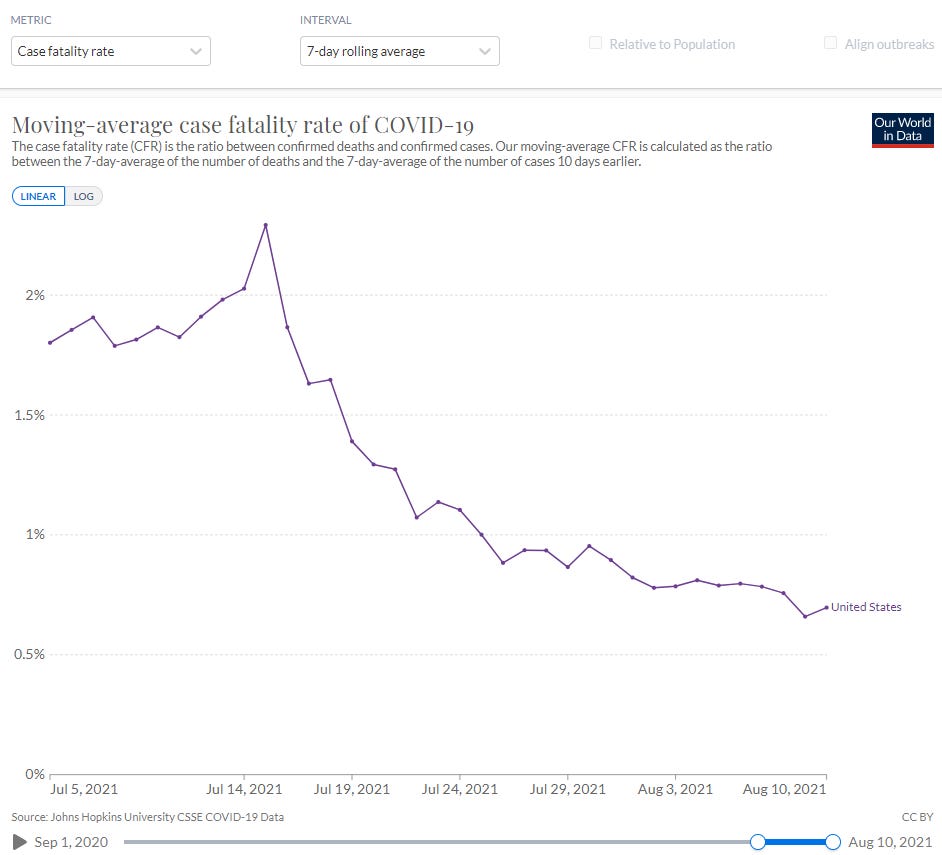 It is noteworthy that the case fatality rate is crashing hard in the U.S., which is in line with my previous calculations and thoughts on how a Delta (variant) wave would affect a risk-benefit assessment.