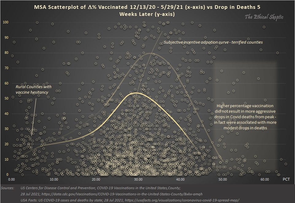 The Ethical Skeptic also tweeted out this scatterplot showing no correlation between vaccine acceptance and performance based on vaccination use (meaning essentially zero net mortality benefit), though I have not had time to check the data. However, as Chris Martenson walks through, the result is consistent with Pfizer's six month mortality report. Take that as you will, but ES has been a source of high factual accuracy and solid reasoning in my experience, whether or not all the ES theories turn out to be correct.