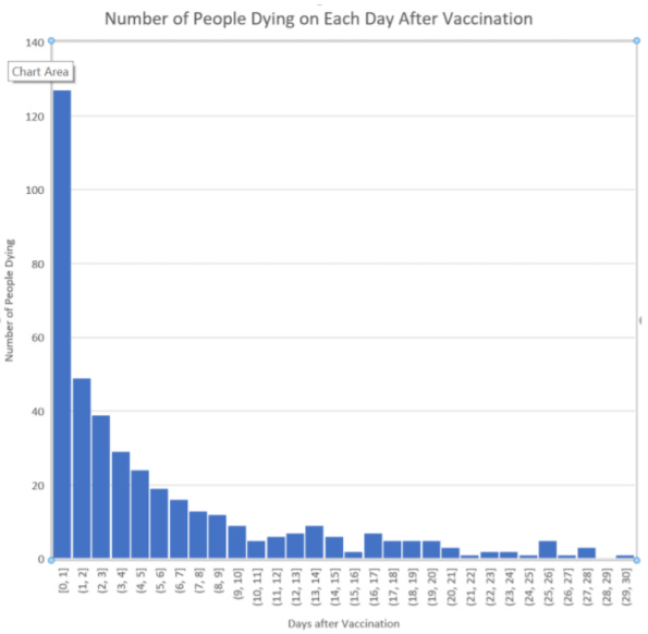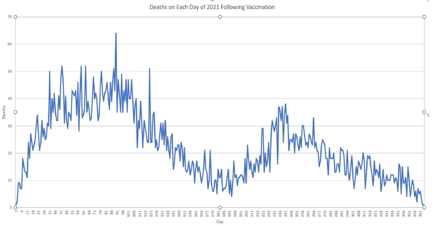 It is indeed strange to see a multi-humped distribution. Those following the VAERS data with open minds are surely aware of the high temporal association of mortality to the first few days after injection. This has been apparent for more than a year—ever since the first few hundred death reports were entered into VAERS.