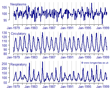 During the extremes of Summer and especially Winter, bodies are under greater stress. Some of the weaker bodies fade and fail at those times. On the whole, we wind up with sinusoidal-esque curves, give or take some differences in shape and amplitudes. But the periods of the curves are important, and I'll explain why.