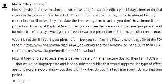 The problem is that when discussing the most important aspects of medical intervention (such as risk-benefit analysis), starting measurement of efficacy at that point makes no sense. But it may not be clear why it doesn't make sense to some people, and bias may get in the way. In order to sort out such temptations to reset basic modeling principles (like to pretend away the first 14 days because maximal efficacy doesn't yet take place), the experienced mathematician or statistician often starts with the extremal principle in order to assess the difference. That is to say that it should be a professional habit to examine a case in the neighborhood of the worst possible scenarios, and then to consider the spectrum of results in between the relevant boundaries.