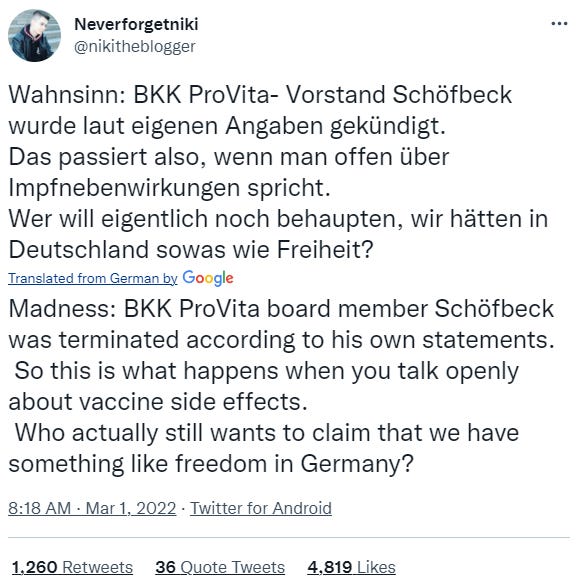 It did not take long for the insurance executive, Andreas Schofbeck, who reported the extrapolation of 400,000 consultations, to be "dismissed without notice after a meeting of the board of directors…" (Boris Reitschuster via Tim Rohn). Further, the discussion of Schofbeck's report from four days earlier was scrubbed from the BKK homepage.