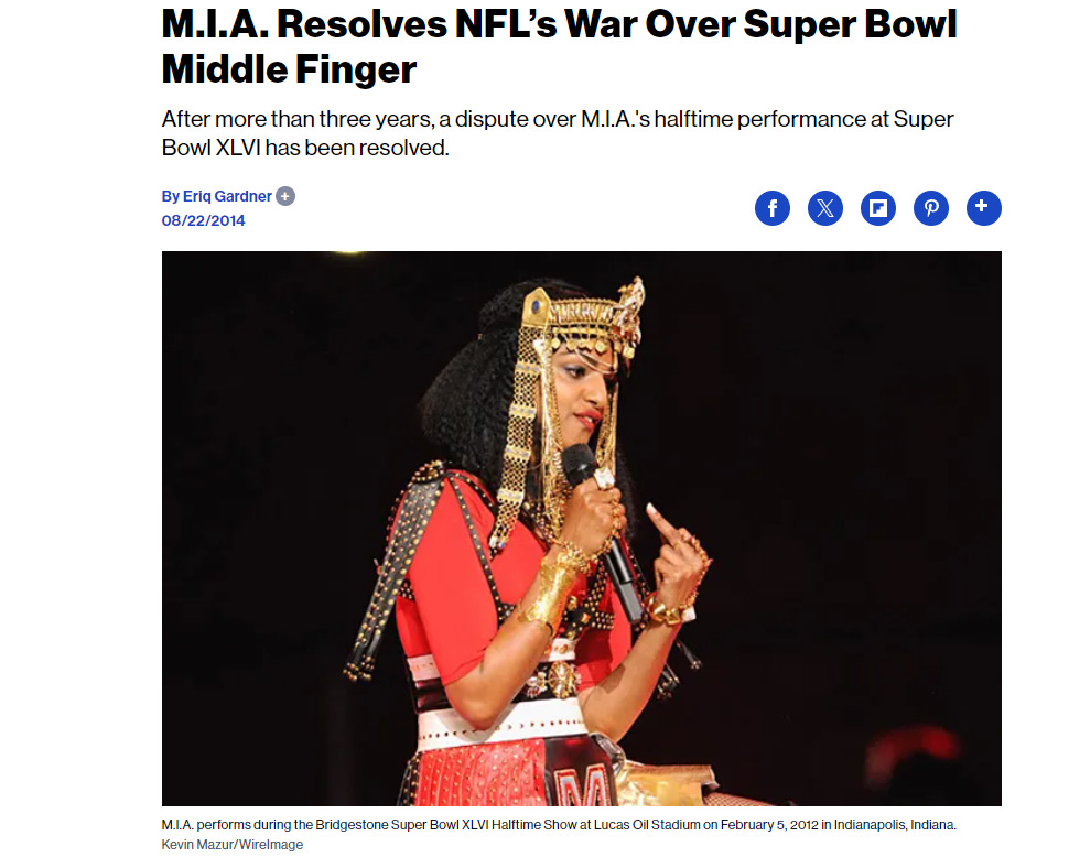 Understand that I'm not shy or easily offended. I grew up in a home where hippies, punks, and random people might at any moment wonder naked, in altered states or otherwise, in or out of any door, perhaps even into the woods behind the house, perhaps with most anything painted on their body, singing or screaming most anything that might be anywhere from beautiful opera to Satanic death metal. But I find the NFL's halftime shows to be boring displays of provocative "Satanic for the heck of it" nonsense. Finding out that the NFL sued M.I.A. for 8-digits over the middle finger, which "tarnished the reputation" of the league makes me wonder if the real motive was to stick it to an artist whose goal was to stick it in America's face from the status of a billionaire bootlegging-banking-"environmentalist" family.