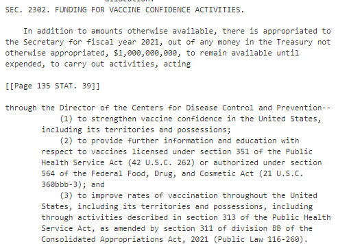 In March 2021, Congress appropriated $1 billion U.S. tax dollars for the Secretary of Health and Human Services to spend on activities to “strengthen vaccine confidence in the United States,” with $3 billion set aside for the CDC to fund “support and outreach efforts” in states through community-based organizations and trusted leaders.