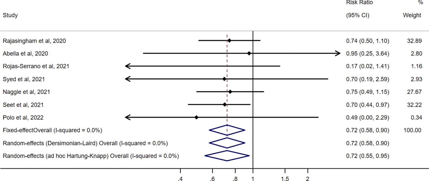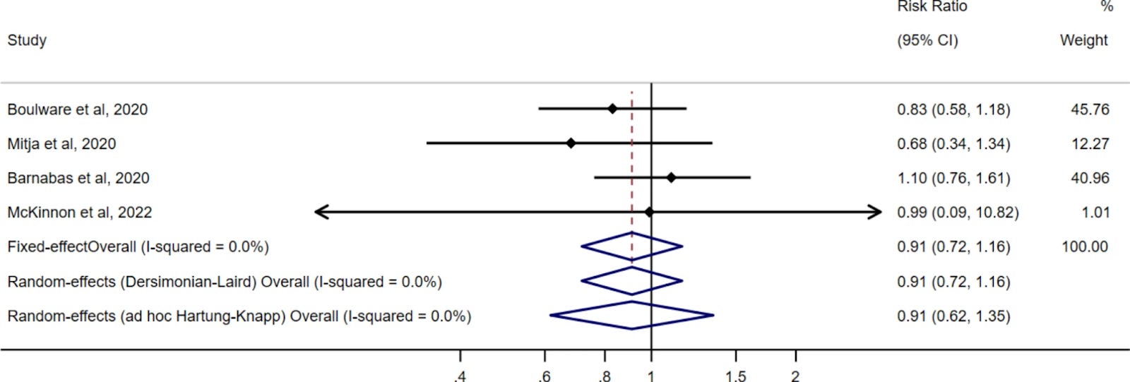 The pooled risk ratio estimate of the pre-exposure prophylaxis trials was 0.72 (95% CI: 0.58–0.90) when using either a fixed effect or a standard random effects approach, and 0.72 (95% CI: 0.55–0.95) when using a conservative modification of the Hartung-Knapp random effects approach. The corresponding estimates for the post-exposure prophylaxis trials were 0.91 (95% CI: 0.72–1.16) and 0.91 (95% CI: 0.62–1.35). All trials found a similar rate of serious adverse effects in the HCQ and no HCQ groups.