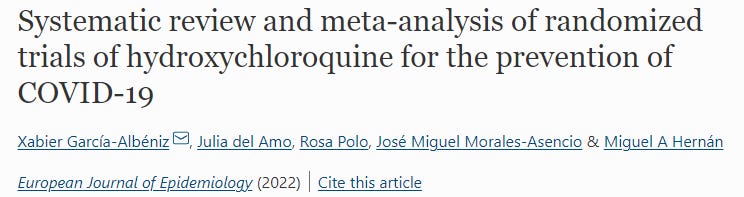 A friend of mine (h/t) who works with the excellent c19early team, and who sends me a few timely research notifications, forwarded me this recently published meta-analysis on the prophylactic effects of hydroxychloroquine (HCQ) for the prevention of COVID-19 (García-Albéniz et al, 2022) a couple of day ago. I'll henceforth refer to this as the "Harvard meta-analysis" since the lead author and the biostatistician are both affiliated with the Harvard T.H. Chan School of Public Health. The Harvard meta-analysis found a statistically significant positive effect from prophylactic use of HCQ.