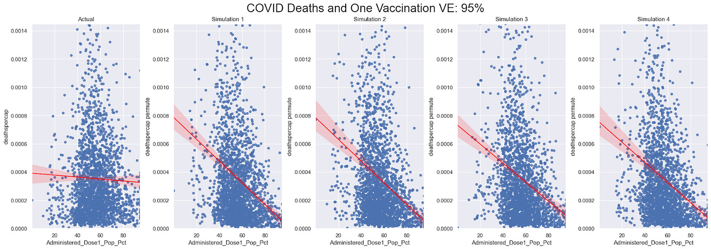 Try to ignore the red trend lines in the plots below. The one on the left was based on real world data (late 2021, but far enough into the vaccine rollout to be robust) and seemed to show a mild negative trend in COVID-19 deaths. The other four are random simulations based on an assumption of 95% efficacy. To most people, the differences in these plots are subtle. To a well-trained data mind, they are obviously vast.