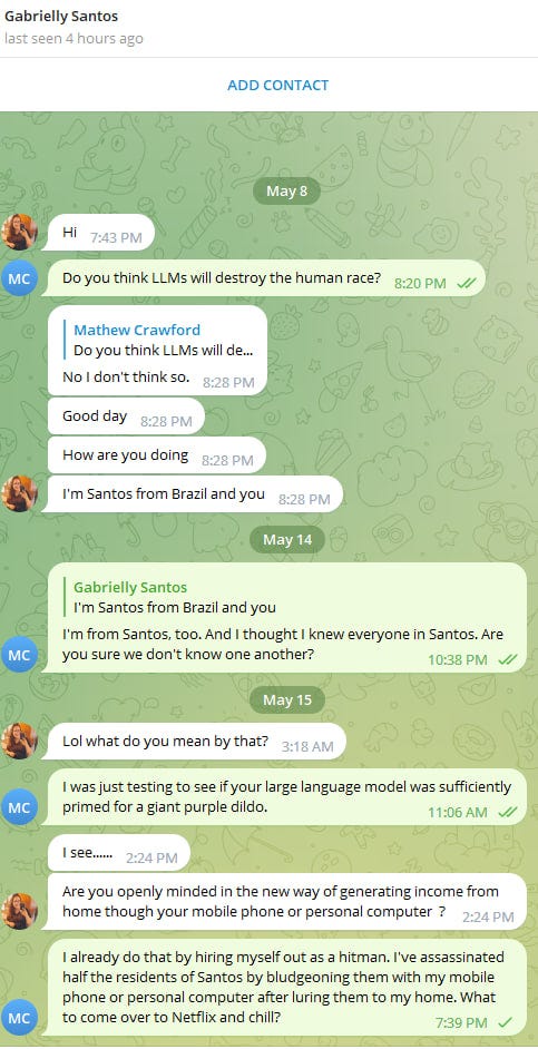 Sure, A.I. chatbots have become good enough to fool a portion of audiences—at least for short durations. The 10% of the time I choose to engage with them on Telegram, I usually ask silly questions like what color underwear turns a cyborg on.