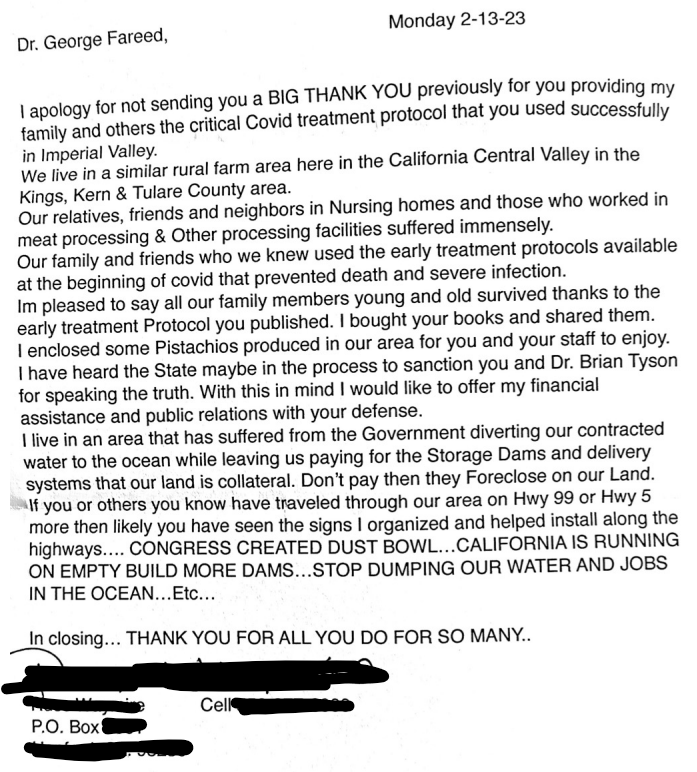 I do think that untreated COVID-19 is dangerous to the elderly in particular, or anyone else whose immune system does not respond well. And I greatly doubt that I've been fooled by a conspiracy with so many personal witnesses. Here is a letter from a patient to Dr. Fareed.