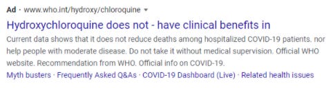 Instead of providing reasonable answers to these obvious critiques, which would risk creation of a record of dialogue, the WHO moved forward with their charade, even taking out paid ads on Google. Note that the ad misleads the reader by not talking about early treatment, but instead about "deaths among hospitalized patients", and in a way that is vague about whether this is an assessment from a single data pool, or a summary data pool. The phrase "myth busters" gets thrown in, which I'm sure excites the motor neurons of Western geeks who enjoy watching people do science more than actually doing it.