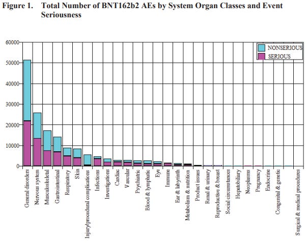 There appear to be 20,000 or so cases of SAEs in the report, and in the initial Pfizer trial, 0.7% of those injected suffered one or more SAEs. I suspect this percentage is low given the extremely healthy nature of the participants in the initial Pfizer trial (based on all-case mortality rates and cardiac events in both arms), but it will do for some basic envelope math.