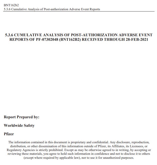 Late yesterday, I received a purportedly leaked copy of a Pfizer post-marketing safety report, marked confidential and dated April 30, 2021 and tracks adverse events through February 28, 2021 of a cohort of 42,086 case reports of patients who suffered post-injection adverse events. The 38-page report, if validated, contains Pfizer's internal knowledge of an extremely serious number of illnesses, injuries, and deaths associated with its injectable product recipients (call them "vaccines" if you like). Note: I cannot yet vouch for the authenticity of the document, but in my opinion, it looks legitimate.