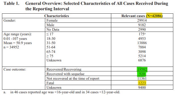 20,000 is 0.7% of 2,850,000 [injected individuals], give or take, so I take that as the population reach of this particular report. The 1223 fatalities represents 430 deaths per million individuals injected, which falls very near numbers that I have computed several times over (here, here, here, and elsewhere).