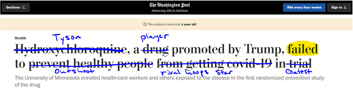 Hopefully you caught on to the hefty pile of absurdities in this tale, which is the thinly disguised tale of how hydroxychloroquine (HCQ) was deemed to have "failed" in randomized control trials. But I'd like to take a moment and walk through, as simply as possible, how an honest statistician sees the evidence.