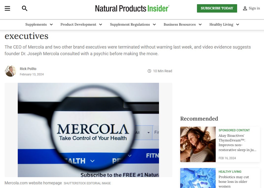 Top executives at Mercola, the brand founded by controversial figure Dr. Joseph Mercola, were terminated last week without notice, and evidence has surfaced that the doctor is taking direction from a man who claims to channel the voice of an “ancient and wise high-vibration entity from the causal plane.”