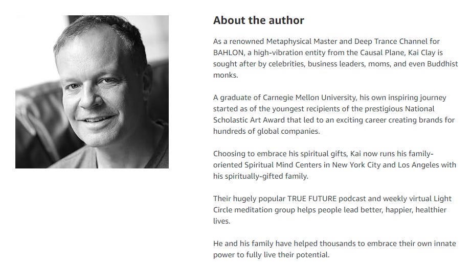 Mercola's guide, whose real adult name may or may not be Kai Clay (I'm not bothering to dig deep for the moment), claims to be a "Metaphysical Master" and "Deep Trance Channel" for "BAHLON", a "high-vibration entity from the Causal Plane" who apparently needs its name typed in ALL CAPS.
