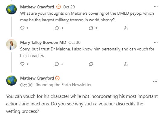 When Robert Malone invited me to his ranch to meet with his intelligence circle, it was during a conversation in which he dodged conversation about the DMED reality he ignored while I was being attacked from many directions, but simply referred to "psyops and counterpsyops". I did not make that trip.