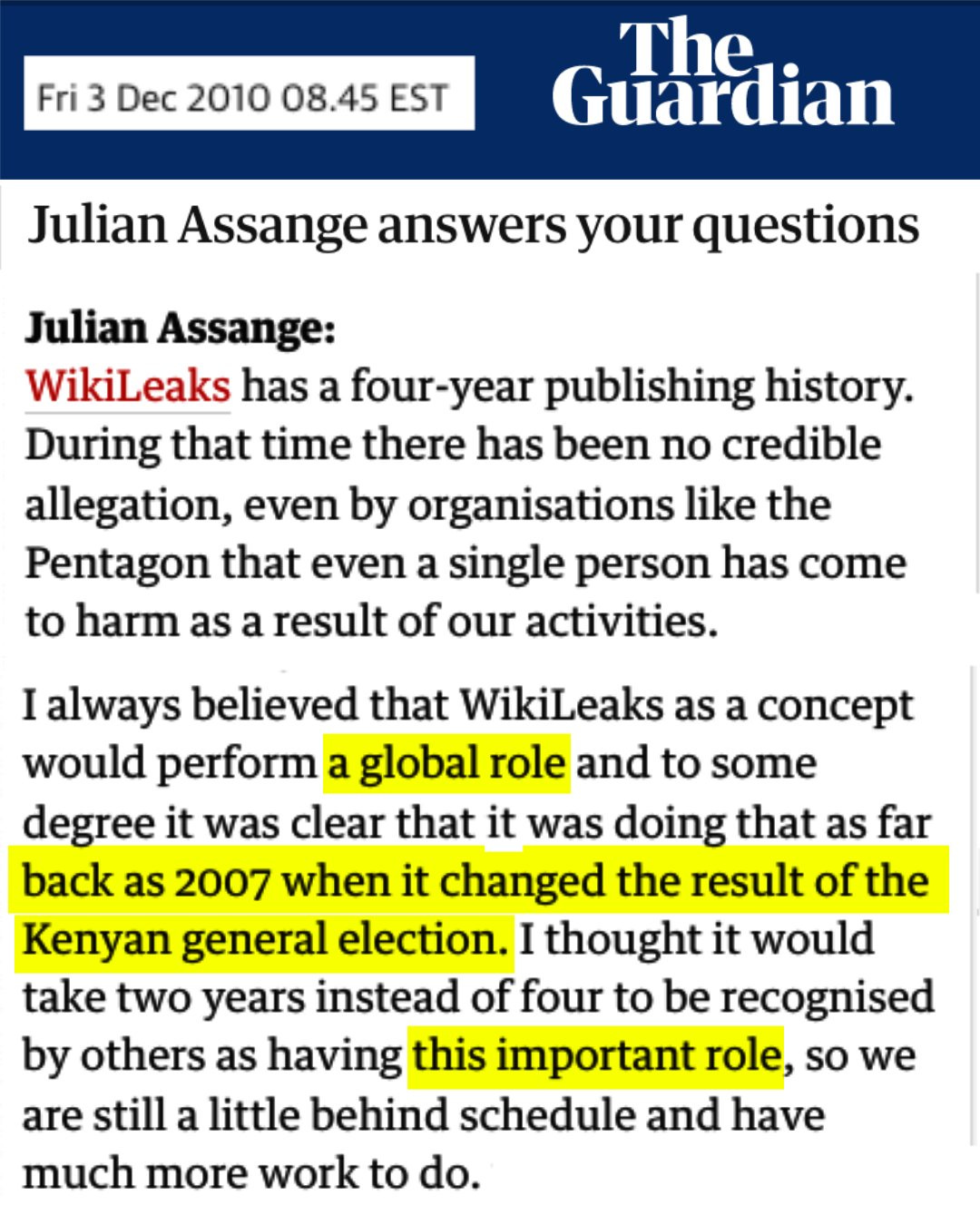 But the report had a chaotic impact on Kenya. Some "mainstream" sources piled on the leak with statements of "perception" about election fraud that cast blame in the direction of both major political blocs, but still with no proof more solid than a U.S.-funded exit poll. Fighting broke out all over the nation with more than 1100 people losing their lives, thousands injured, tortured, or raped, and 600,000 more displaced. Assange sees the crisis as an advertisement about how Wikileaks changed the result of an election.