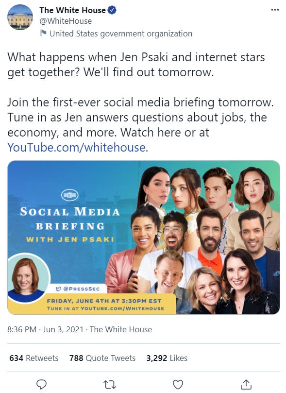 Orwellian, sure. But how specifically?Reality Show Politics Episode 1Mathew CrawfordJun 05, 2021∙ Paid5ShareThis tweet screams a lot of things. Reining all of those things into a succinct summary isn't easy, but I'll go the artistic route: Come, Eloi. Do not resist. We will love and care for you.Continue reading this post for free, courtesy of Mathew Crawford.Claim my free postOr purchase a paid subscription.