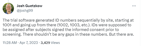 This sounds juicy, but let us first remind ourselves that regardless of any original criminal sin, the trial data never looked as clean as the image that was sold to us (by the world's largest corporate criminal offender that is standing trial for funding terrorists who murdered American troops, ahem).