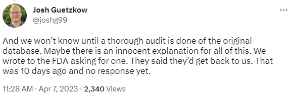 And when an algorithm this important isn't followed, you can and should expect a note in the trial supplement explaining the reason why (much like lopsided data exclusions). These omissions should look sinful to any faithful scientific mind. Somebody who ignores them should not be trusted for judgment.