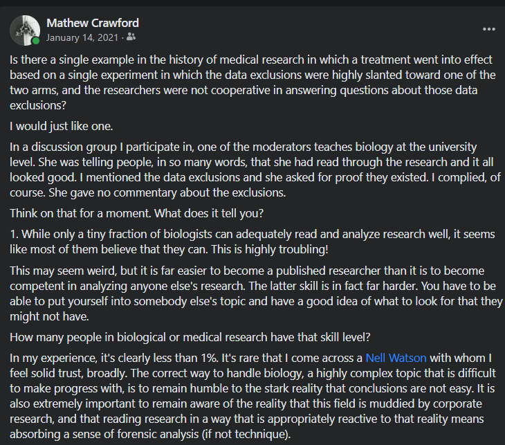 Though many of my posts were deleted off of Facebook, and I was banned there for nearly five months of 2021, it is clear that I was responsible for bringing attention to the topic of the data exclusions from early on. (I mention this not because I need any congratulations, but mostly because I've wagered that Steve's article will champion his blogging of the fact without mention of how I pointed this out to him around May 2021. It is important that the attention monopolists keep me invisible.)