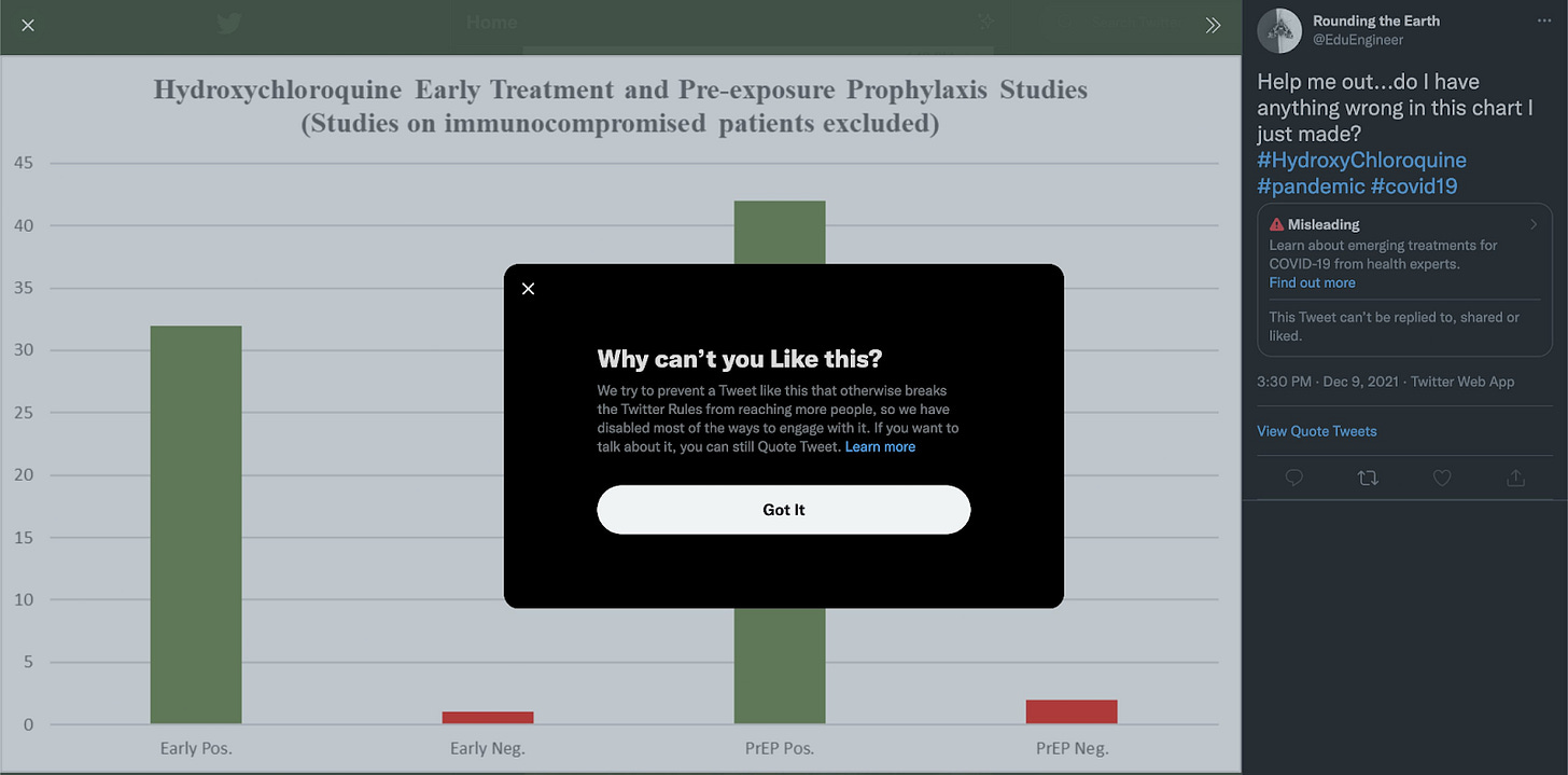 My tweet of the image was censored faster than that. I'd say it took a grand total of two or three minutes. This is far from my first experience of censorship. I've served around 130 days of suspension at Facebook this year, my treatment research group there deboosted constantly, and many warnings attached to my posts. But the way this happened in a matter of minutes was startling, so I'm going to assume that I'm right over the target. This is a great graph to share with friends who just haven't taken the time to see what the pharmaceutical industry, captured regulators, and media have to do to keep people from understanding the evidence.