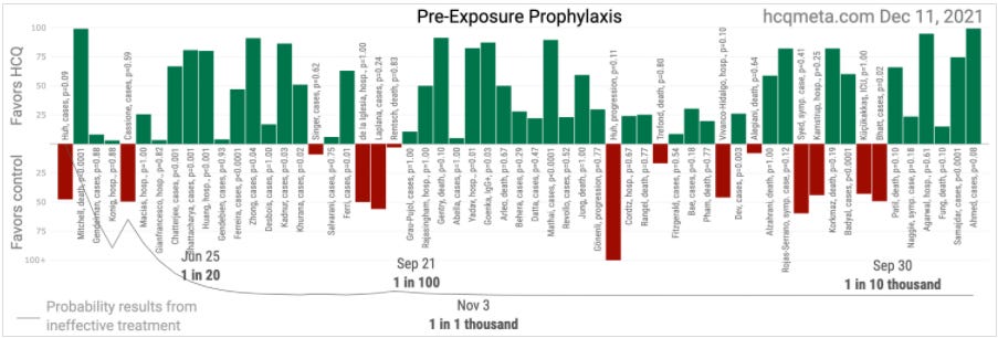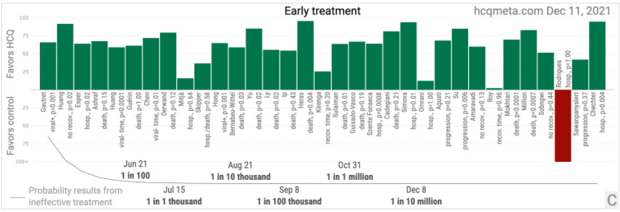 Mild spoiler: I did not want to live without making the point about the screamingly apparent consistency of hydroxychloroquine (HCQ) early treatment research. It was part of a one-two punch, following the image below. The hcqmeta.com chart is meant to give the reader a sharp mental turn upon seeing the visual explanation I created to help people understand why the WHO trials on hydroxychloroquine were meaningless (and probably designed to fail [and kill people]).