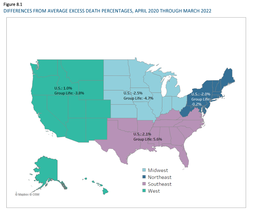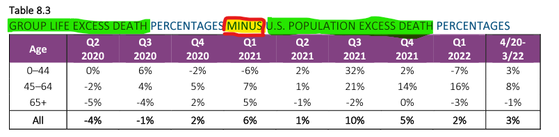 That was where we were when the latest Society of Actuaries report hit the ground, which shows group life insureds—particularly of working age—seeing even more excess mortality than the larger U.S. population. In particular, the sharp numbers during Q3 2021 coincides with vaccine mandates for working age individuals.